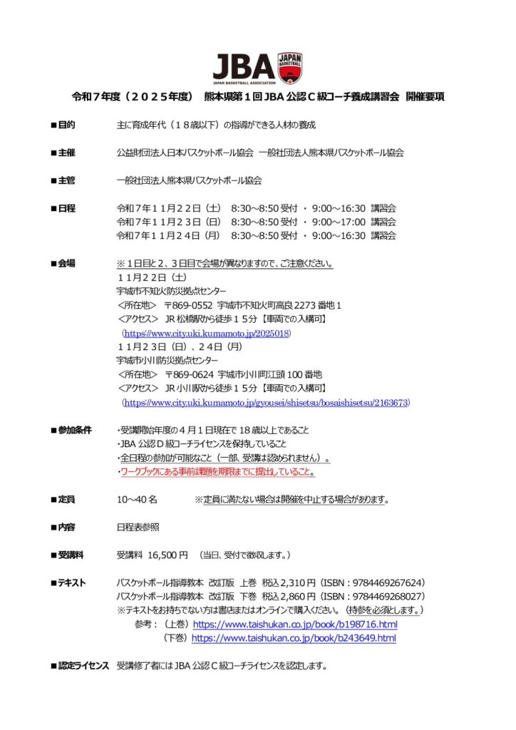 JBA公認C級コーチ養成講習会(対面講習)開催要項